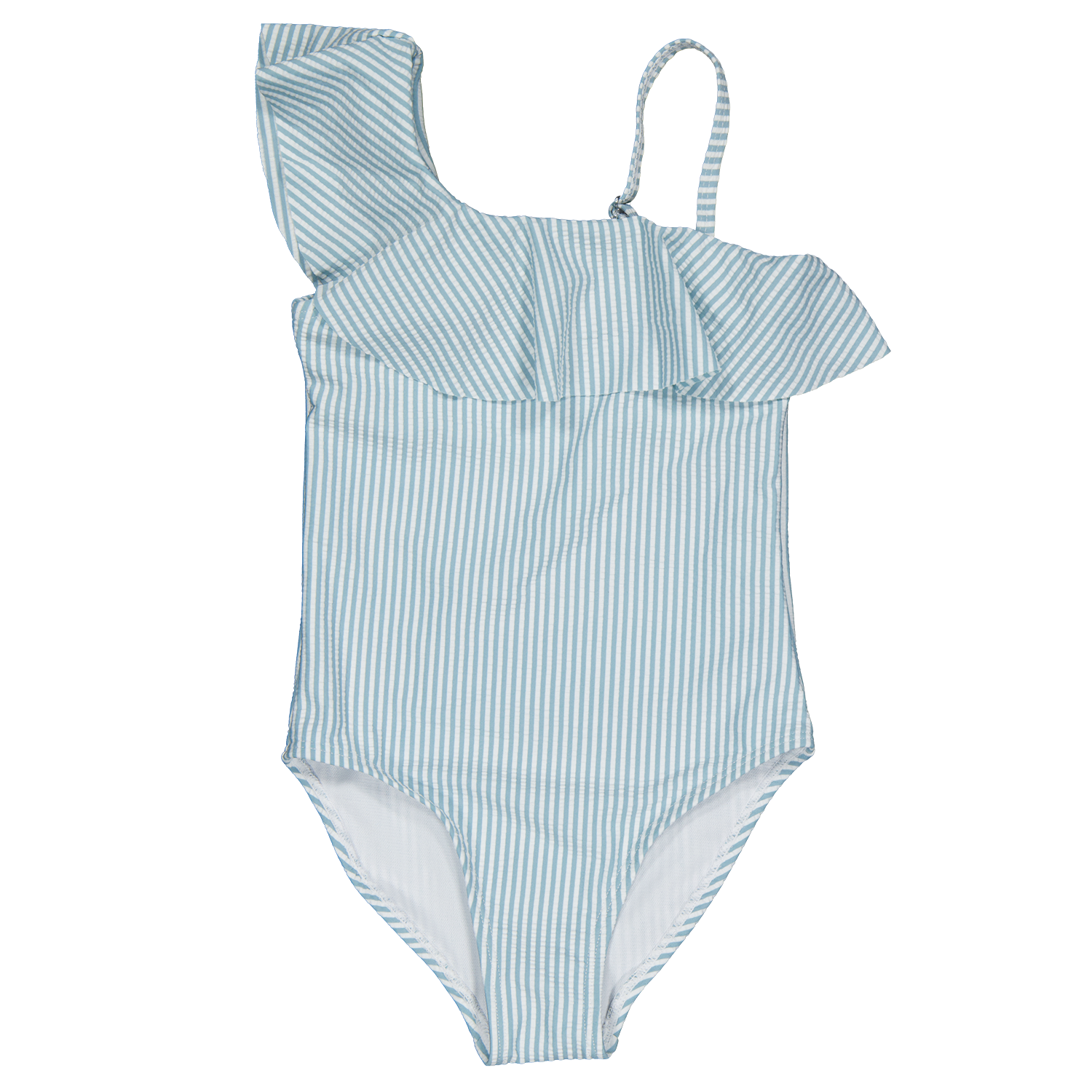 Dit badpak voor tienermeisjes heeft een frisse blauwe kleur met gestreepte details. De schouderband en de ruffle geven een speelse uitstraling. Gemaakt van 53% polyester, 41% polyamide en 6% elastaan, biedt het comfort en een goede pasvorm. De voering is 100% polyester voor extra zachtheid.