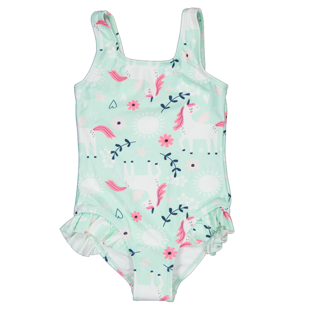 Deze zwemtuit is speciaal ontworpen voor meisjes en is uitgevoerd in een frisse groene kleur met een vrolijk unicorn-print. De stof bestaat uit 80% polyamide en 20% elastaan, wat zorgt voor een comfortabele fit en bewegingsvrijheid. De voering is gemaakt van 100% polyester. De schouderbandjes bieden goede ondersteuning en het ruffle detail aan de onderkant geeft een speelse uitstraling. Ideaal voor een leuke dag in het zwembad.