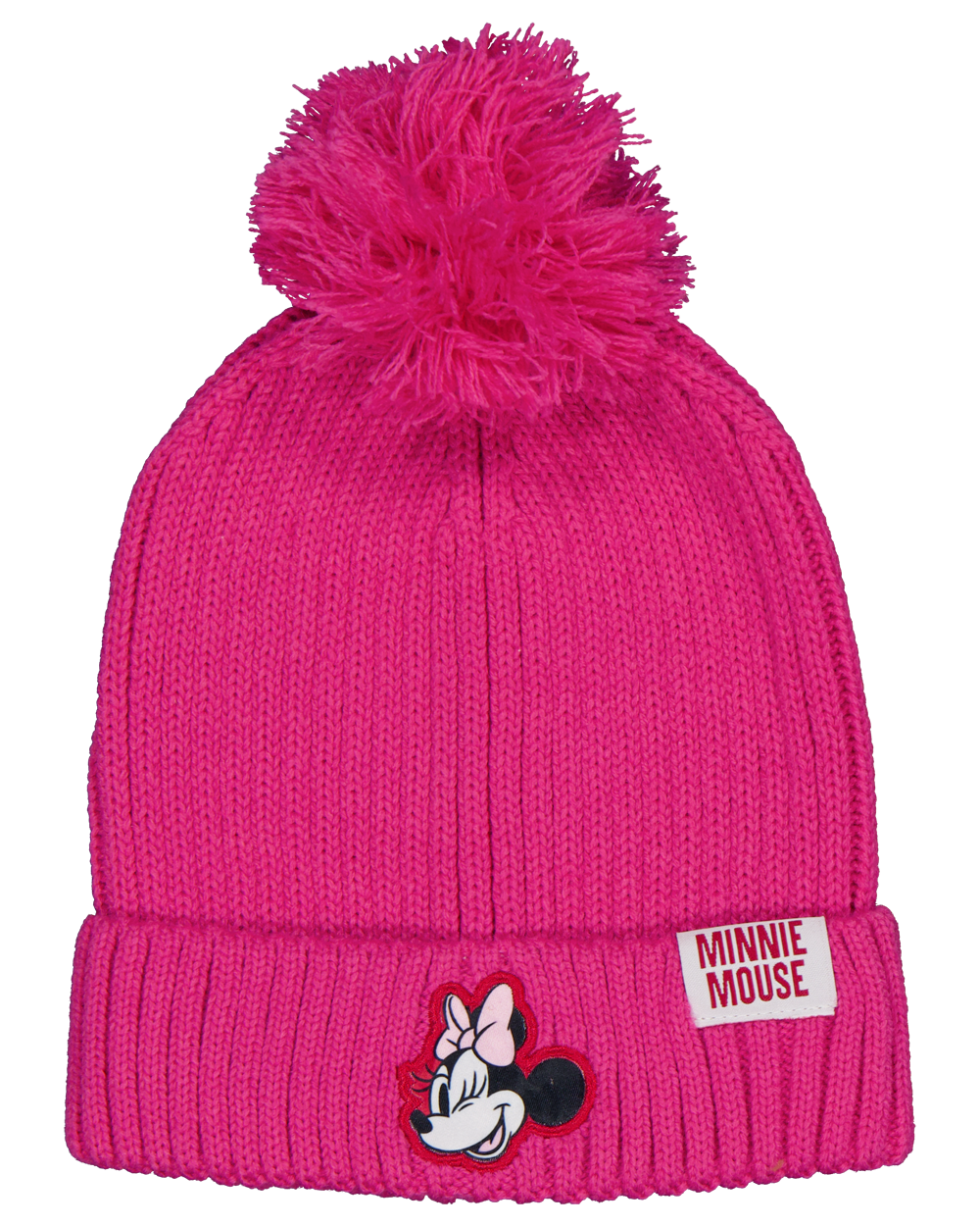 Deze roze beanie heeft een pompon bovenop en een omgeslagen boord. Op de boord staat een afbeelding van Minnie Mouse en een label met tekst. De beanie houdt je hoofd heerlijk warm tijdens koude dagen.