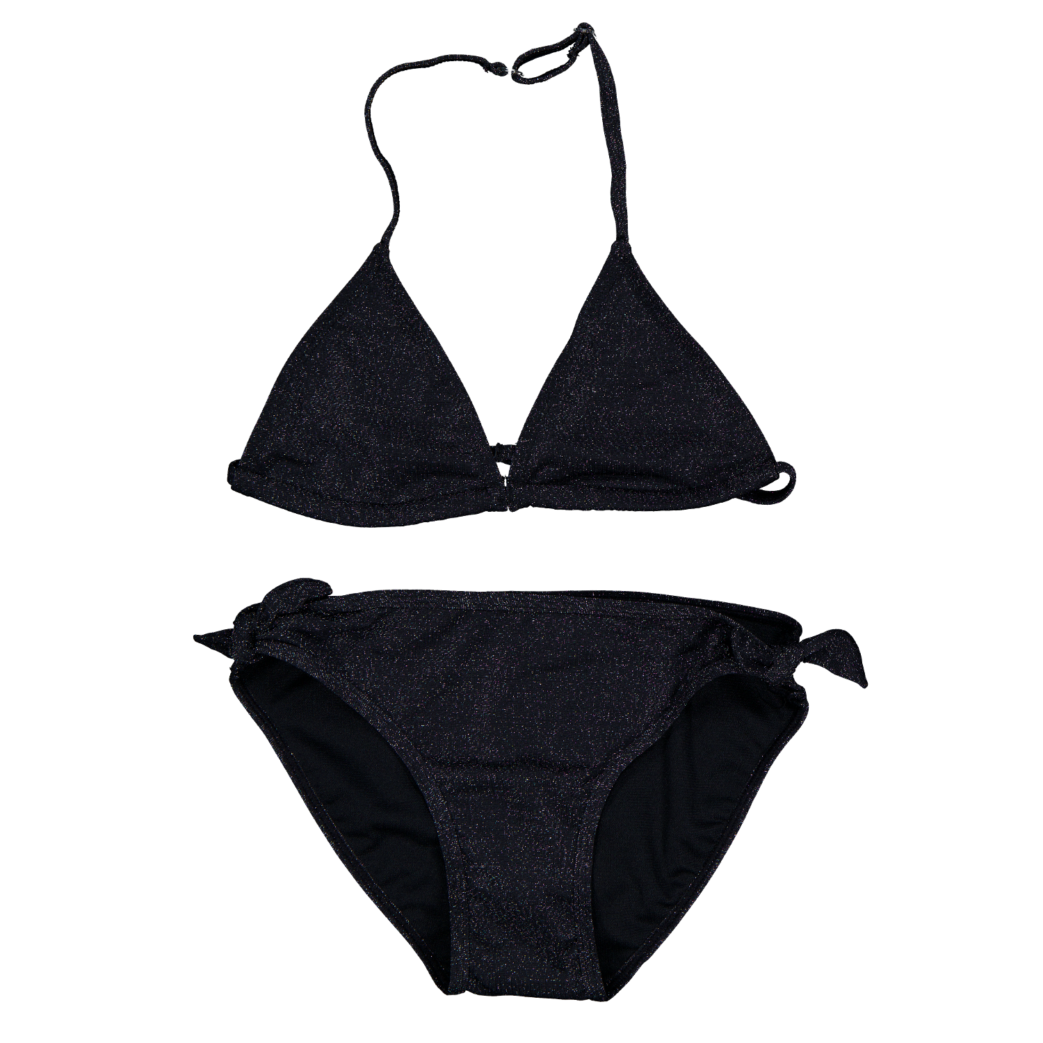 Deze zwarte bikini is geschikt voor tieners en bestaat uit een top en een broekje. De samenstelling van de stof zorgt voor een comfortabele pasvorm. Het bovenstuk heeft een halterband, terwijl het broekje zijkanten heeft die zijn te knopen. Deze bikini is een goede keuze voor de zwempartij.