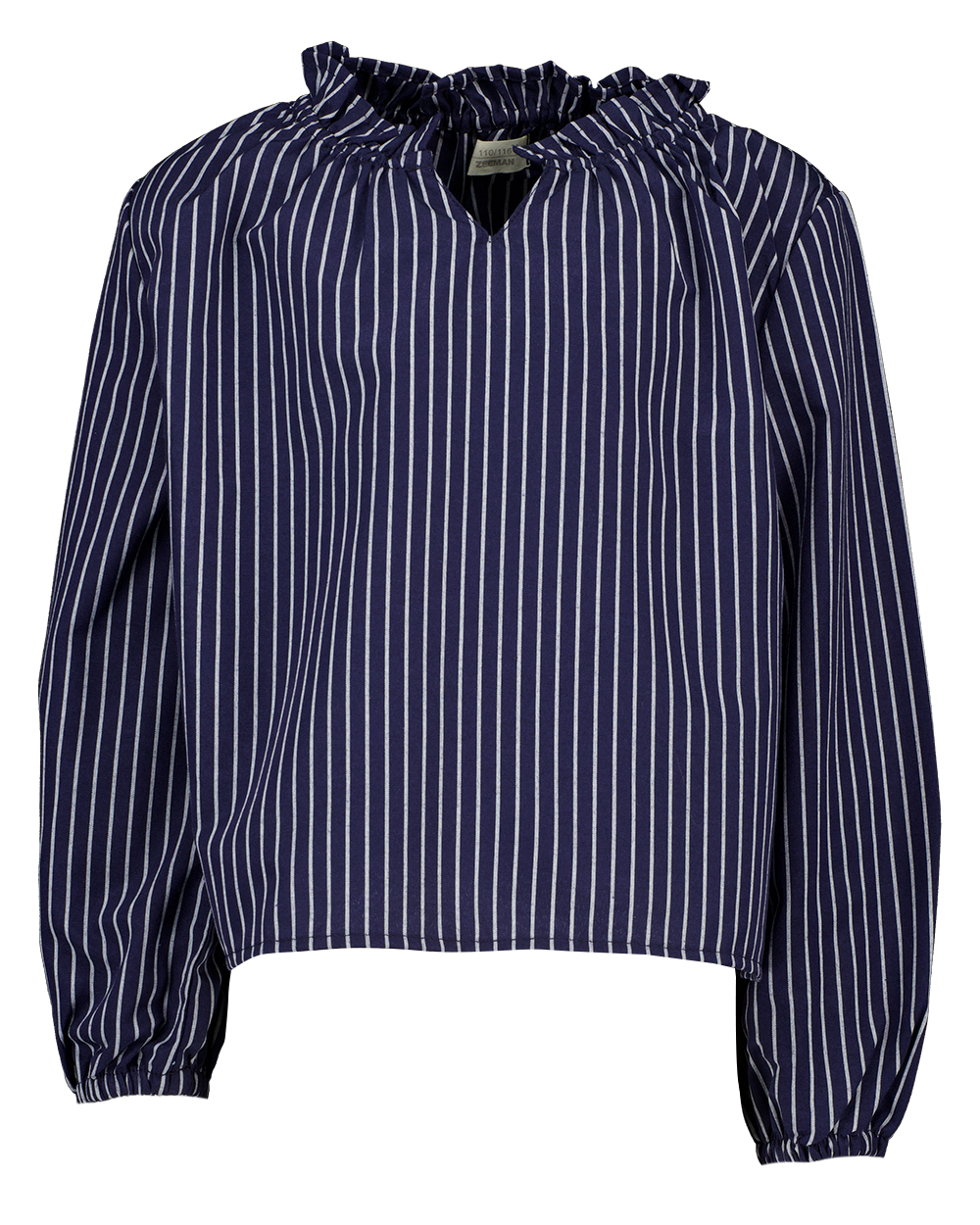 Deze blouse heeft een donkerblauwe kleur met witte verticale strepen. De hals is afgewerkt met een lichte ruffle en een kleine V-uitsnede. De lange mouwen hebben elastiek bij de polsen voor extra comfort. De stof bestaat uit 86% polyester en 14% katoen, wat zorgt voor een soepele en lichte draagervaring. Ideaal voor een nette, maar comfortabele uitstraling.