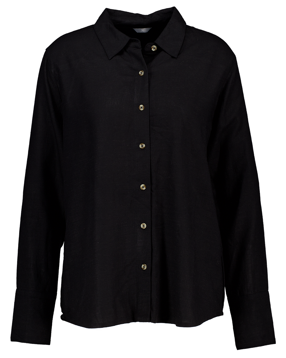 Deze zwarte blouse is gemaakt van 85% viscose en 15% linnen. Dit zorgt voor een luchtige en comfortabele pasvorm. De blouse heeft een klassieke kraag en knoopjes aan de voorkant. Met lange mouwen is het een veelzijdige optie die gemakkelijk te combineren is met andere kledingstukken.