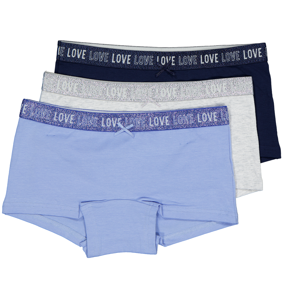 Set van 3 boxers in de kleuren lichtblauw, grijs en donkerblauw. De boxers hebben een elastische tailleband met glitters, waardoor ze goed op hun plek blijven. Door het naadloze ontwerp zijn er geen storende naden, wat zorgt voor extra draagcomfort. De zachte katoenmix voelt prettig aan op de huid.