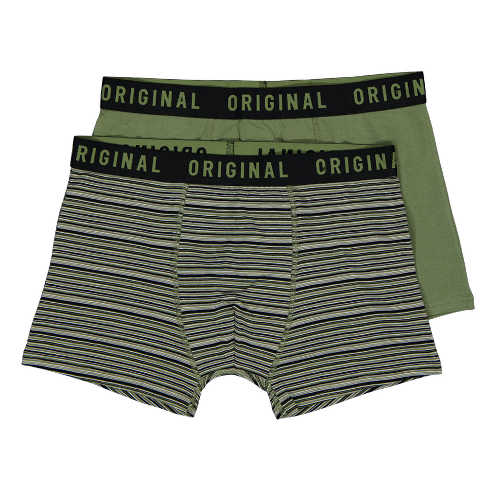 Deze set van 2 boxers voor heren bestaat uit één donkergroene en één gestreepte variant. De elastische tailleband zorgt ervoor dat de boxers goed blijven zitten. Door de combinatie van het katoen en een klein beetje elastaan zijn de boxers comfortabel en rekbaar. Dat geeft extra bewegingsvrijheid tijdens het dragen, de hele dag door.