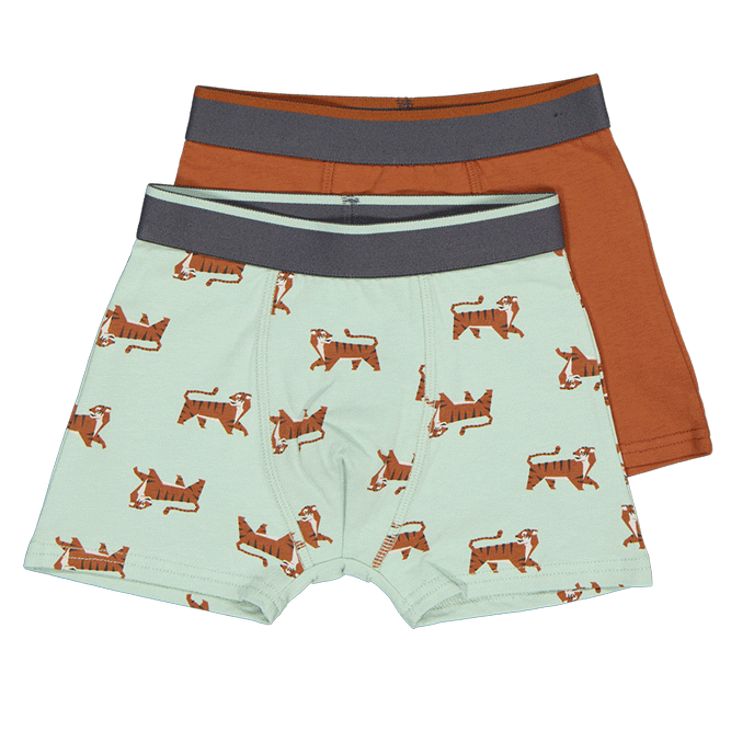 Set van 2 boxers in groen en bruin. Eén boxer heeft een dierenprint, de andere is effen. Gemaakt van zachte stof met 95% katoen en 5% elastaan, voor een comfortabele pasvorm die licht meerekt. De elastische tailleband zorgt dat de boxers goed blijven zitten. Geschikt om elke dag comfortabel te dragen.