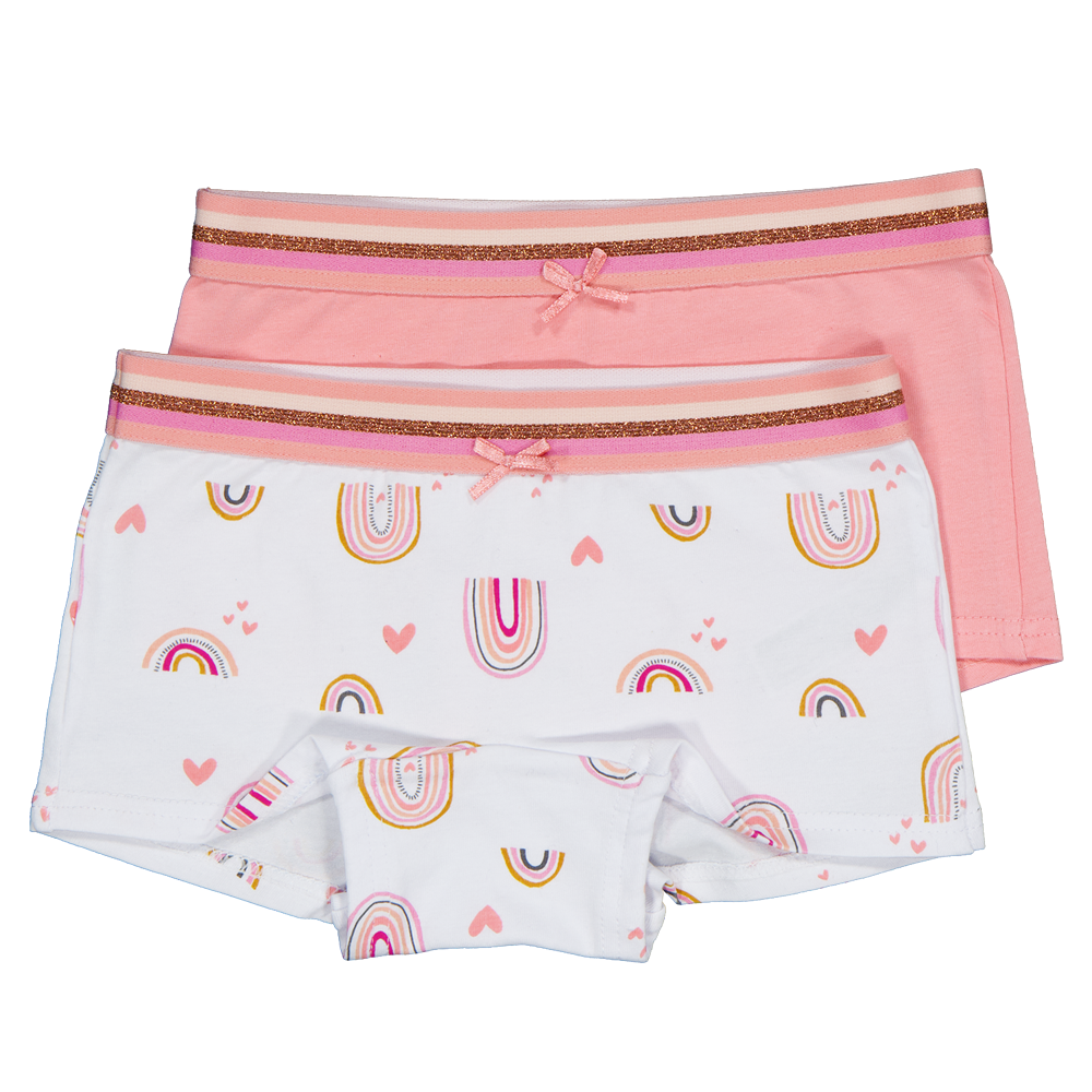 Set van 2 boxers in verschillende kleuren. Eén boxer heeft een witte kleur met regenbogen en hartjes, de andere is effen roze. De elastische tailleband met glitterrand zorgt voor een comfortabele pasvorm. Het zachte katoen met elastaan voelt prettig aan en zorgt dat de boxers goed aansluiten op het lichaam.