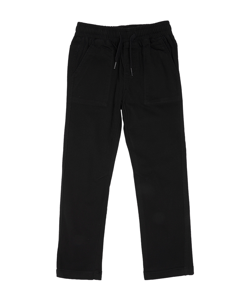 Deze zwarte jongensbroek is gemaakt van katoen, polyester en elastodieen. De broek heeft een elastische tailleband met koord, waardoor hij goed blijft zitten en makkelijk aan te trekken is. De effen kleur maakt combineren eenvoudig. De stevige, zachte stof geeft extra draagcomfort, zodat jongens zich vrij kunnen bewegen tijdens het spelen of op school.