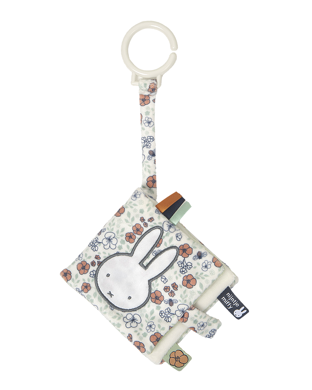 Dit buggyboekje is gemaakt van zacht materiaal en heeft een vrolijk bloemenpatroon. Door het handige lusje met ring kun je het eenvoudig aan een buggy of kinderwagen bevestigen, zodat je het onderweg niet kwijtraakt. Praktisch en leuk voor onderweg met baby.