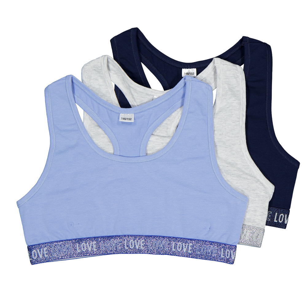 Set van 3 croptops in de kleuren lichtblauw, grijs en donkerblauw. De brede elastische band zorgt dat de top goed blijft zitten en draagt comfortabel. Gemaakt van 95% katoen en 5% elastaan, voelt de stof zacht aan en rekt licht mee. Ideaal als basis onder kleding voor elke dag.
