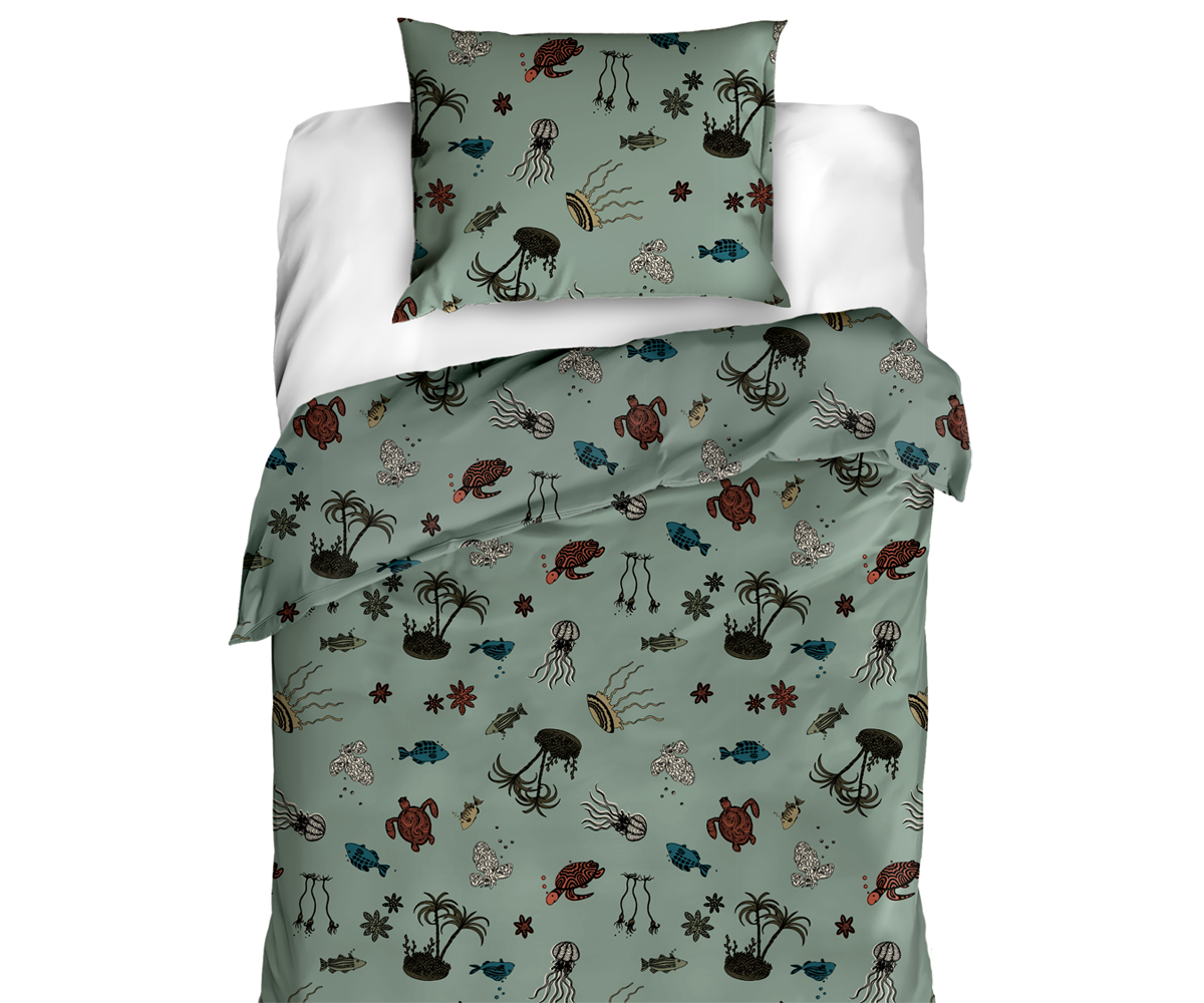 Dit dekbedovertrek heeft een dessin met zeeleven en is in de kleur groen. Het overtrek heeft een afmeting van 140 bij 200 centimeter en past op éénpersoonsbedden. Hierdoor geef je de slaapkamer een frisse uitstraling met een rustig patroon.