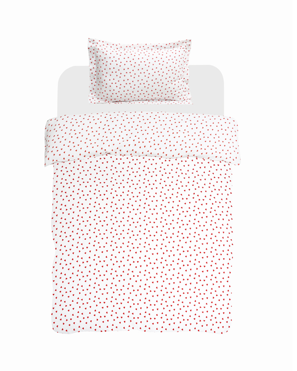 Dit geweven dekbedovertrek is voorzien van een patroon met kleine rode hartjes op een witte ondergrond. Het voelt prettig aan en geeft je slaapkamer een frisse, lichte uitstraling. Het overtrek is ideaal om je bed compleet te maken en zorgt voor een gezellige en uitnodigende sfeer in de kamer.