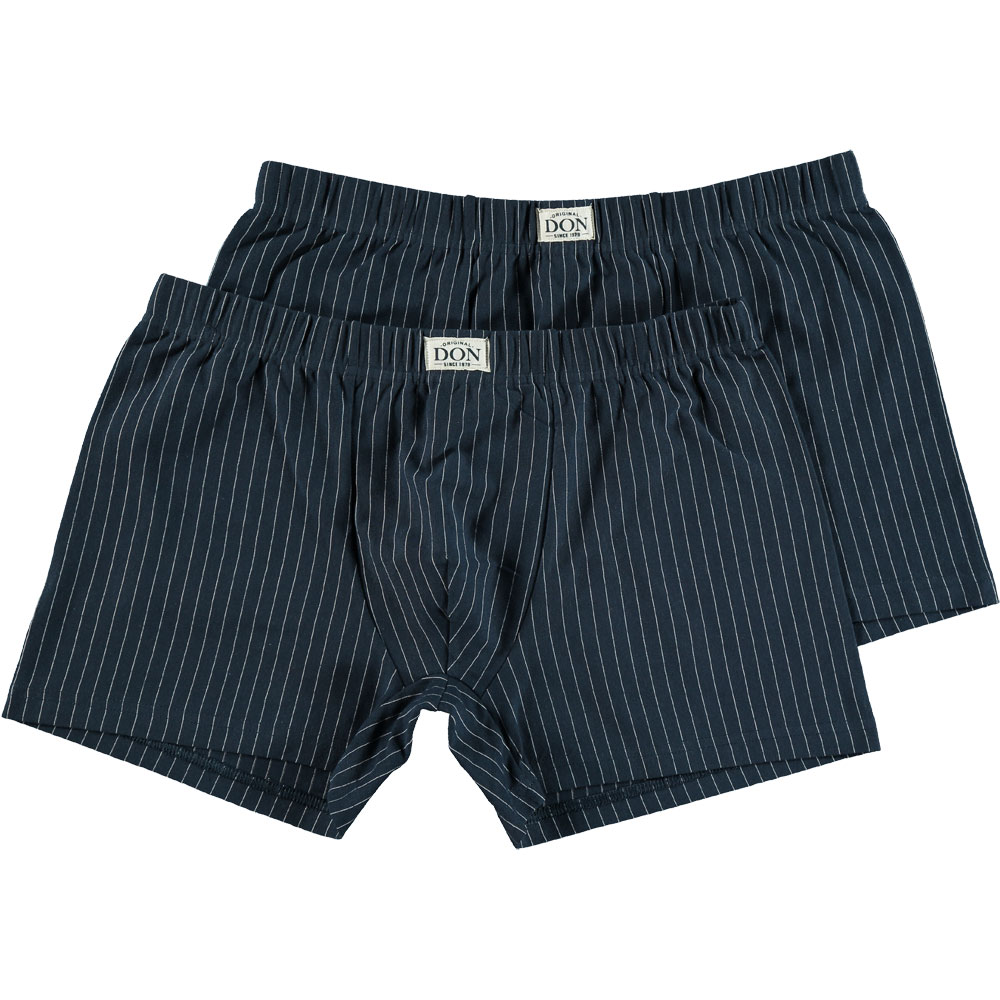 Set van 2 Don boxershorts voor heren in donkerblauw met fijne verticale strepen. Gemaakt van 95% katoen en 5% elastaan, waardoor de stof stevig is en licht meerekt. De elastische tailleband zorgt ervoor dat de boxers goed blijven zitten. Deze boxers bieden comfort en bewegingsvrijheid, geschikt voor dagelijks gebruik.