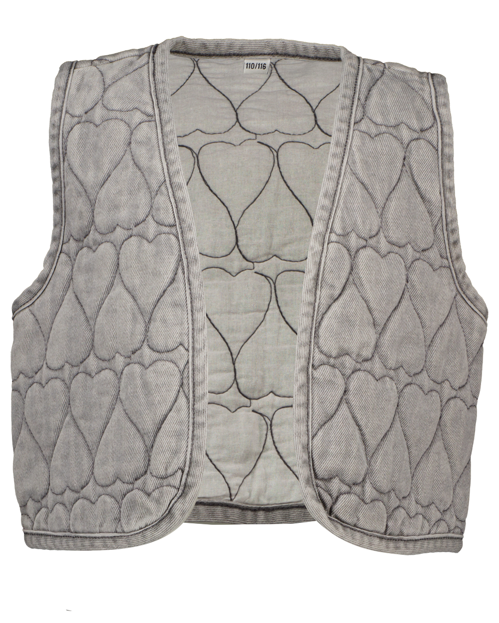Grijs gilet voor meisjes met een doorgestikt hartjespatroon. Dit mouwloze model heeft een open voorkant zonder sluiting en is netjes afgewerkt langs de randen. Ideaal om te dragen over een shirt of trui voor extra warmte op frisse dagen en ook leuk om je outfit mee af te maken.