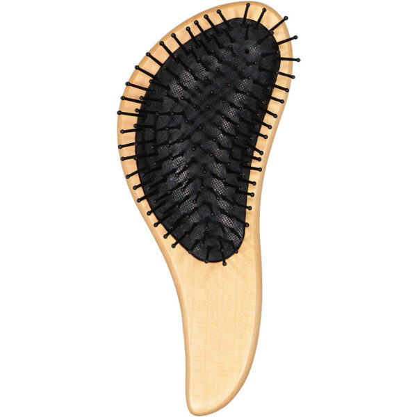 Deze bruine haarborstel heeft een gebogen vorm, waardoor hij prettig in de hand ligt. De stevige, zwarte pinnen helpen het haar makkelijk en soepel te ontwarren. Dit maakt de borstel geschikt voor dagelijks gebruik bij de verzorging van het haar. Praktisch in gebruik en handig om klitten snel uit het haar te halen.