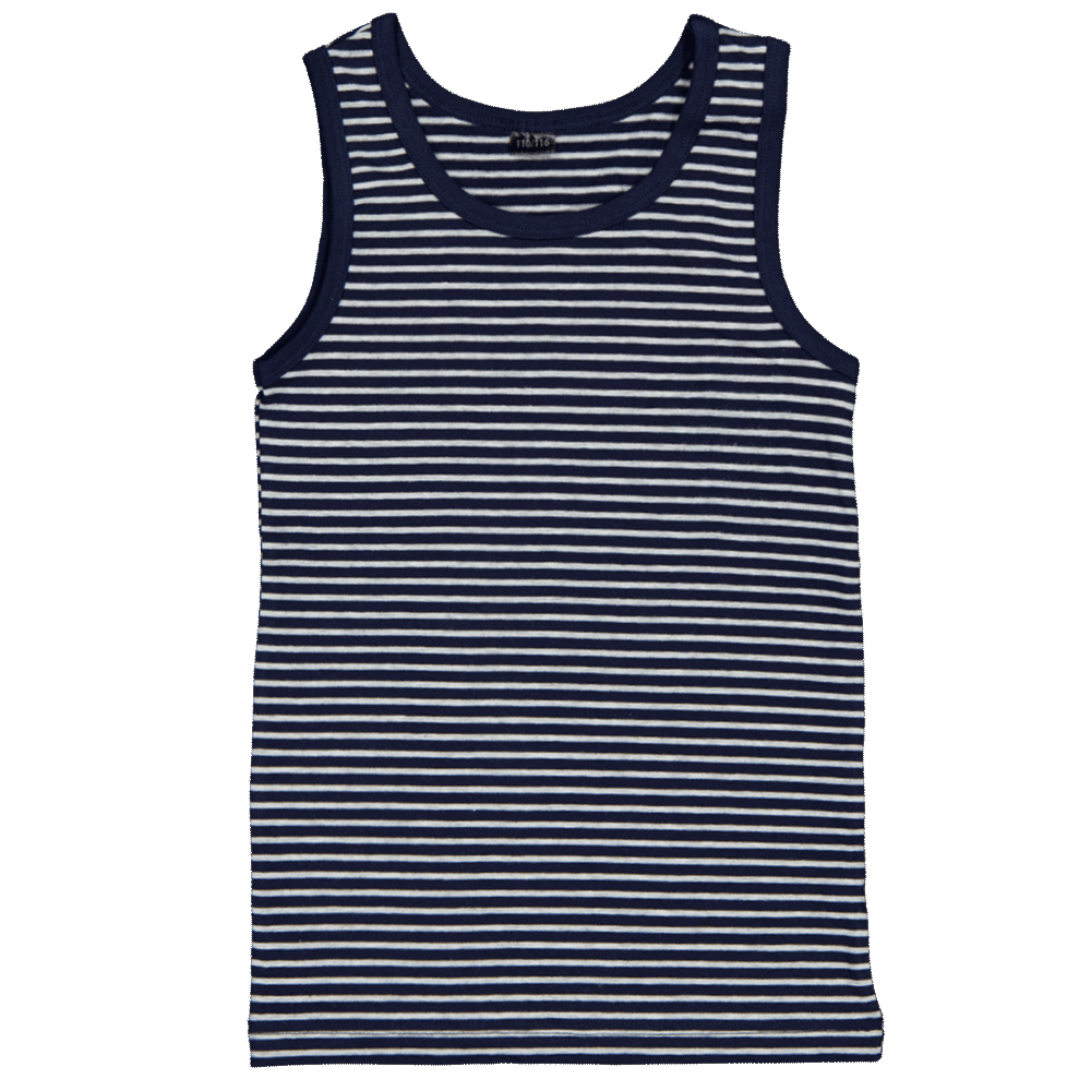 Dit mouwloze jongenshemd heeft donkerblauwe en witte strepen. De ronde hals en armsgaten zijn afgewerkt met donkerblauwe boorden, wat zorgt voor prettig draagcomfort. Het katoen met een beetje elastaan maakt het hemd licht elastisch, zodat het goed meerekt en fijn zit. Dit hemd is geschikt om los te dragen of onder een shirt.