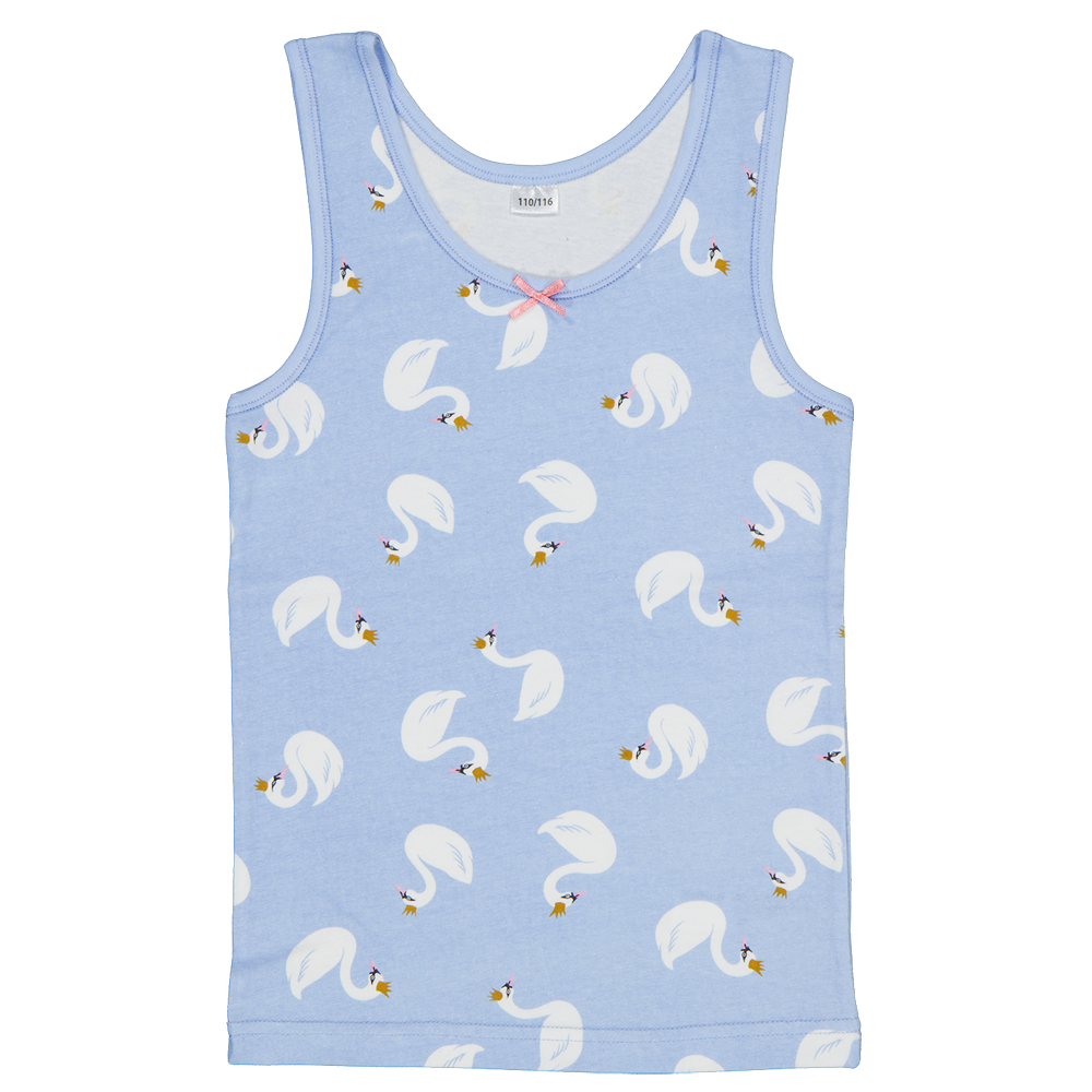 Dit blauwe hemd voor meisjes is gemaakt van 95% katoen en 5% elastaan. De stof is zacht en licht elastisch, waardoor het comfortabel zit en goed meebeweegt. Dankzij de ronde hals en mouwloze snit is het makkelijk te dragen onder een trui of als extra laagje. Het dessin met witte zwanen geeft een vrolijke uitstraling.