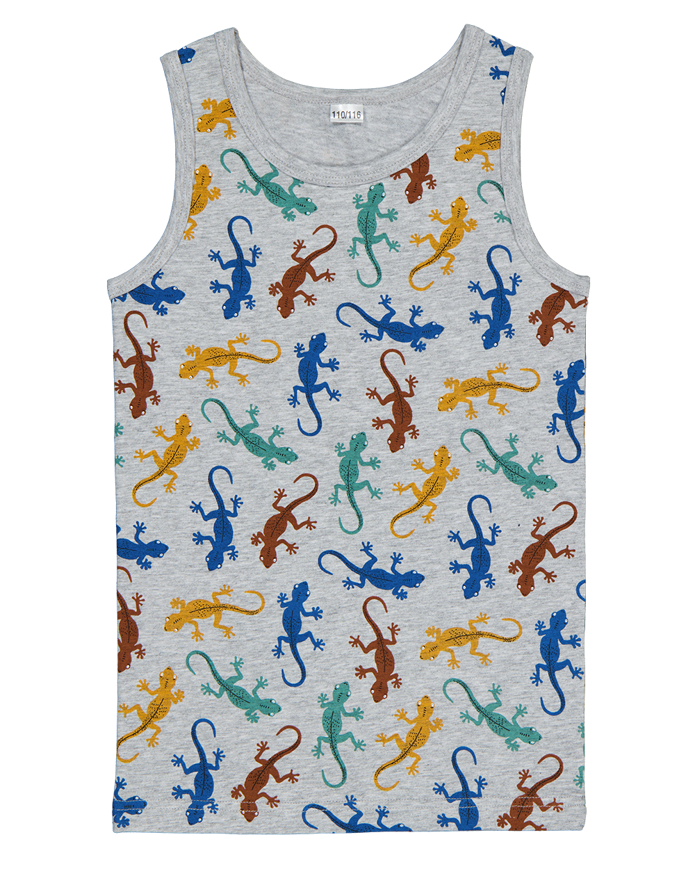 Dit grijze hemd voor jongens heeft een vrolijke print met gekleurde hagedissen. Het is gemaakt van katoen met een klein aandeel elastaan, wat zorgt voor een comfortabele pasvorm. Je draagt het bijvoorbeeld onder een shirt of los op warme dagen.