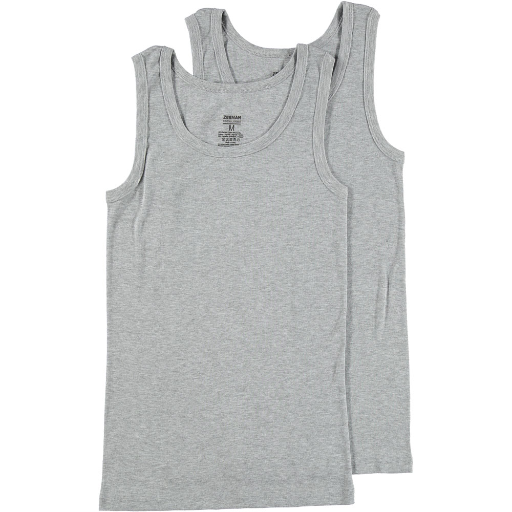 Deze grijze heren hemden zijn gemaakt van een zachte en soepele stof. Door het mouwloze model met brede schouderbanden heb je veel bewegingsvrijheid, bijvoorbeeld tijdens het sporten of onder een overhemd. De ronde hals sluit mooi aan en de afwerking met smalle, stevige zomen zorgt ervoor dat het hemd goed in vorm blijft, ook na meerdere wasbeurten. De verpakking bevat twee stuks, zodat heb je altijd een schoon hemd bij de hand.
