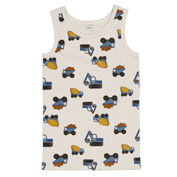 Dit jongenshemd is grijs en heeft een print met bouwvoertuigen zoals kiepwagens en graafmachines. Het hemd is mouwloos en gemaakt van katoen met een beetje elastaan. De stof voelt zacht aan en rekt licht mee. Daardoor zit het hemd comfortabel en kan je kind zich makkelijk bewegen tijdens het spelen of andere activiteiten.