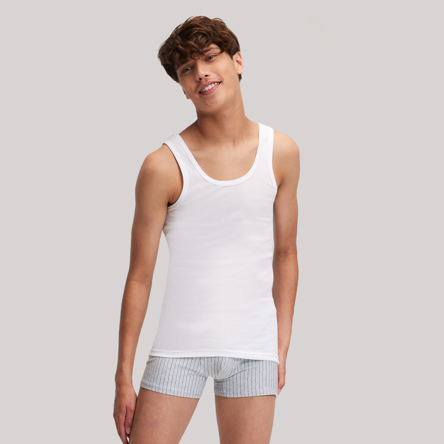 Dit witte heren hemd is gemaakt van zacht katoen. Het mouwloze model is goed te dragen als extra laagje onder een trui of tijdens warme dagen. De ronde hals sluit mooi aan en de afwerking met smalle, stevige zomen zorgt ervoor dat het hemd goed in vorm blijft en niet langs de huid schuurt. Zo zit dit hemd de hele dag lekker. Een goed basic die bij iedere outift past.