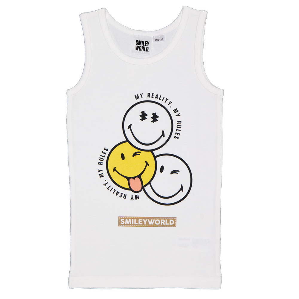 Dit witte tanktop voor jongens is gemaakt van 95% katoen en 5% elastaan, wat zorgt voor een fijne stretch en comfort. Het ontwerp met vrolijke smileys op de voorkant geeft een speelse uitstraling. Ideaal om te combineren met verschillende outfits voor een casual look. Verkrijgbaar in een enkele verpakking.