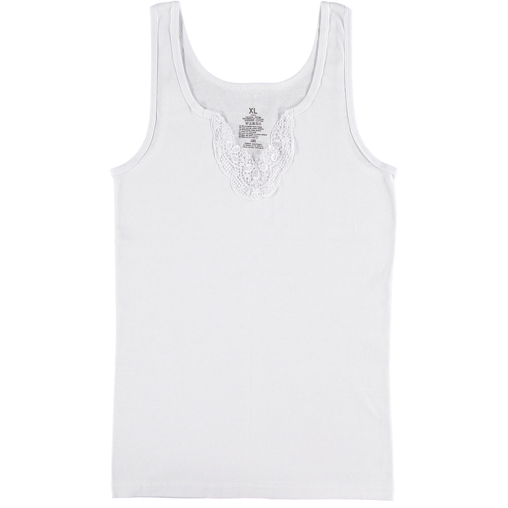 Dit witte dames hemd is gemaakt van een stevige ribstof van katoen. Het model is mouwloos en heeft een ronde hals met kanten details. De rechte zoom en de nette afwerking maken dat je dit hemd goed kan dragen als onderdeel van je outfit of als extra laagje. En door de witte kleur is het hemd goed te combineren met verschillende kledingstukken.