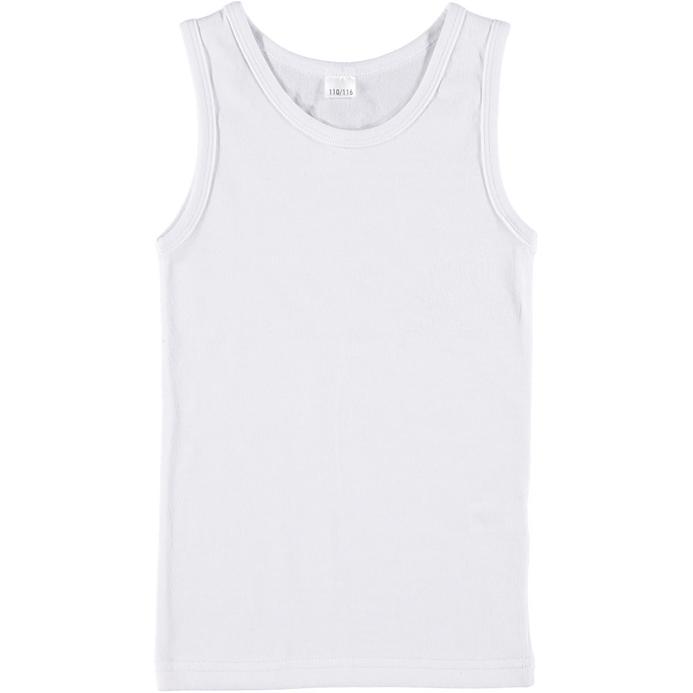 Deze witte tanktop voor jongens is gemaakt van een comfortabele mix van 95% katoen en 5% elastaan. Dit materiaal zorgt voor een fijne pasvorm en flexibiliteit. De ronde hals biedt een makkelijke toegang en de top is ideaal voor in laagjes of als basis voor verschillende outfits.