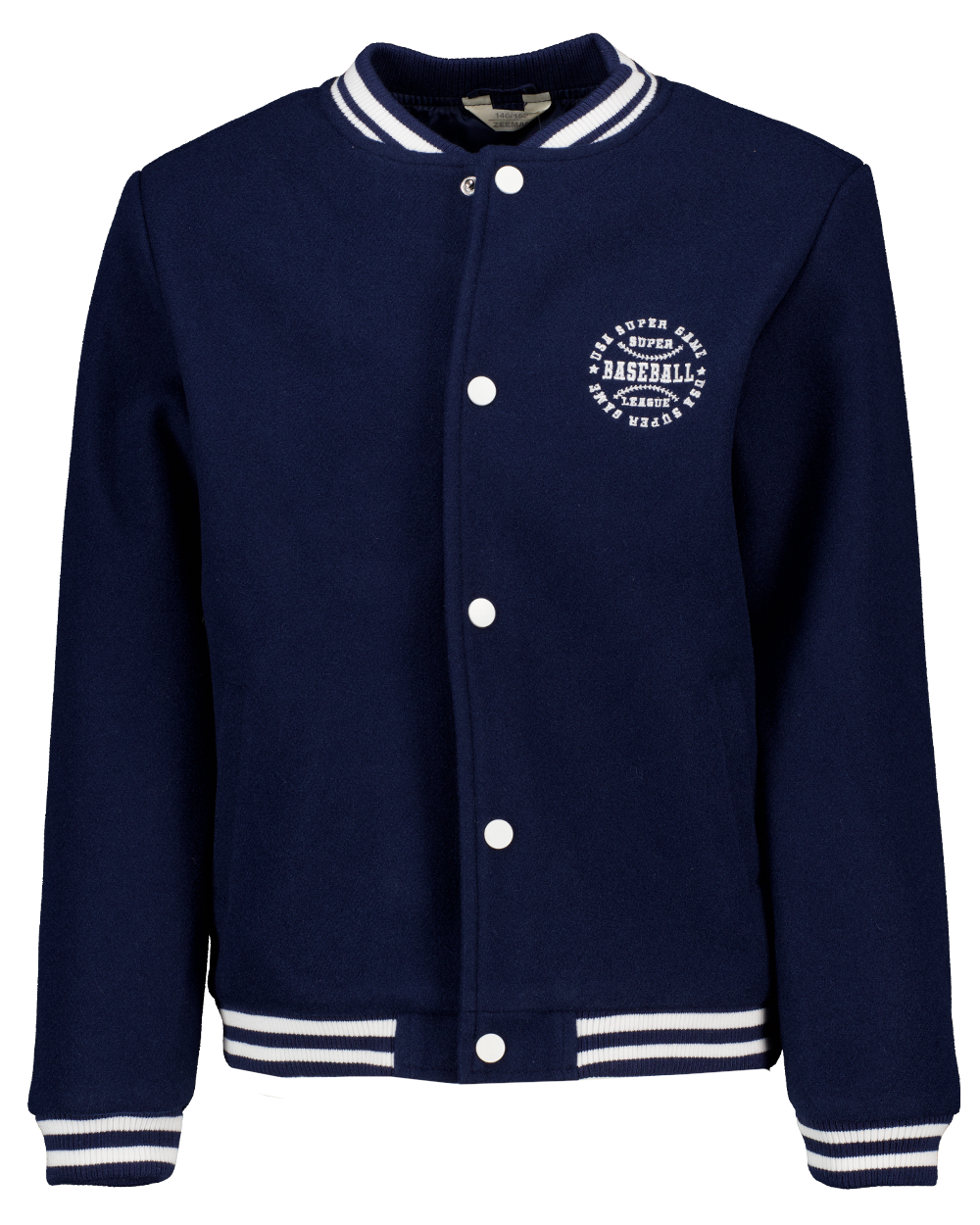 Deze blauwe honkbaljack is gemaakt van 100% polyester en heeft een sportieve uitstraling. Het jack heeft witte knopen aan de voorkant en een ronde kraag met gestreepte boord. Ook de mouwuiteinden en onderkant zijn voorzien van een gestreepte afwerking. Op de borst staat een kleine, witte opdruk met de tekst 'Baseball'. Ideaal als extra laag op frisse dagen.