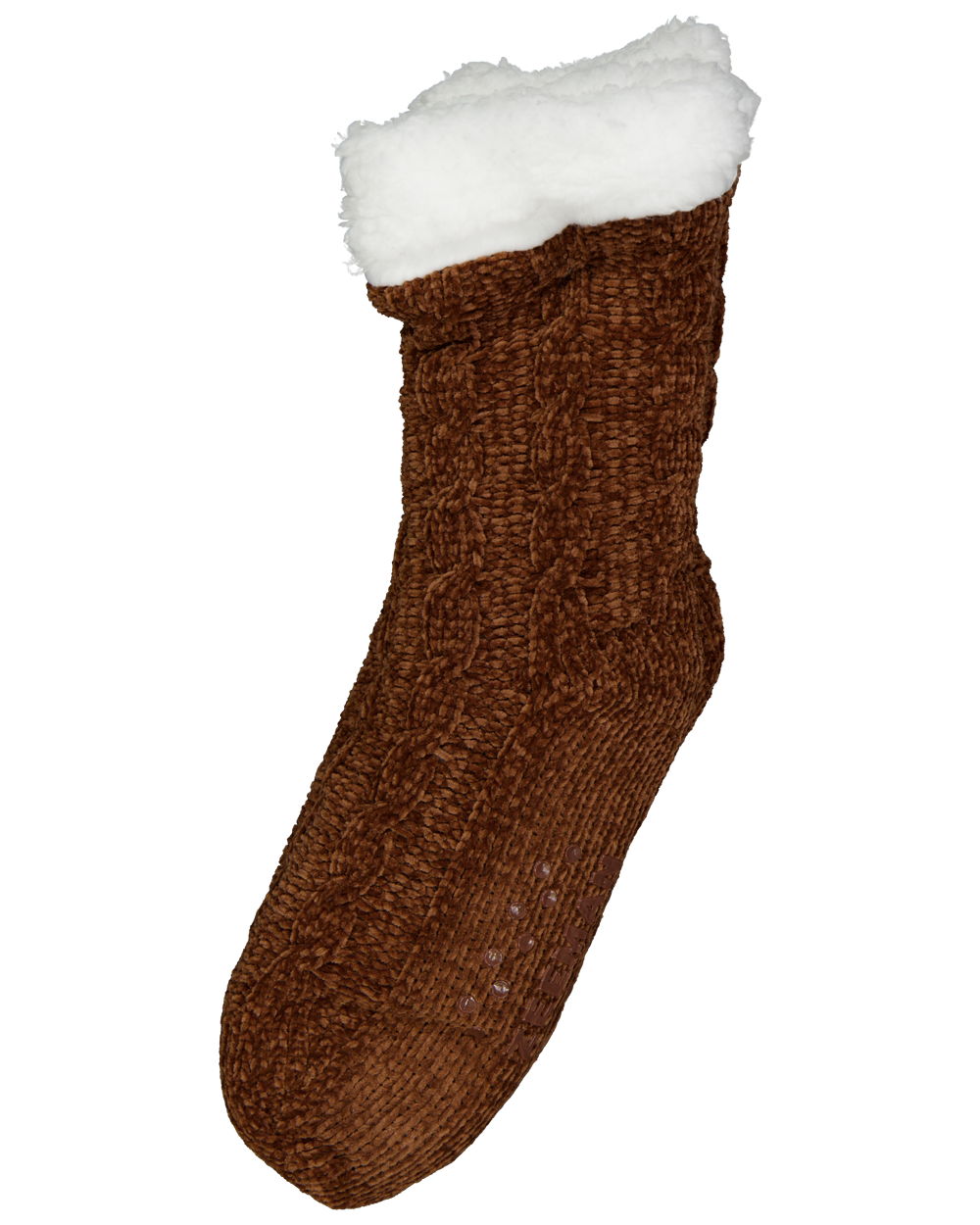Deze huissokken zijn gemaakt van van een zachte, fluwele stof en hebben een kabelpatroon. Van binnen zijn de sokken gevoerd met extra zacht sherpa-fleece. Hierdoor blijven je voeten lekker warm en zijn deze sokken ideaal voor de knusse avonden thuis. Door het anti-slip materiaal aan de onderkant heb je meer grip op gladde ondergronden en glijdt je niet uit. De stof is voor 100% gemaakt van polyester.