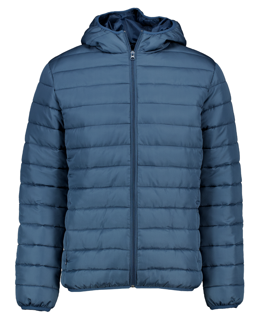 Deze blauwe herenjas heeft lange mouwen en een capuchon. De buitenkant, voering en vulling zijn volledig van polyester. Dankzij de vulling biedt de jas extra warmte. Je sluit de jas eenvoudig met een rits aan de voorkant.