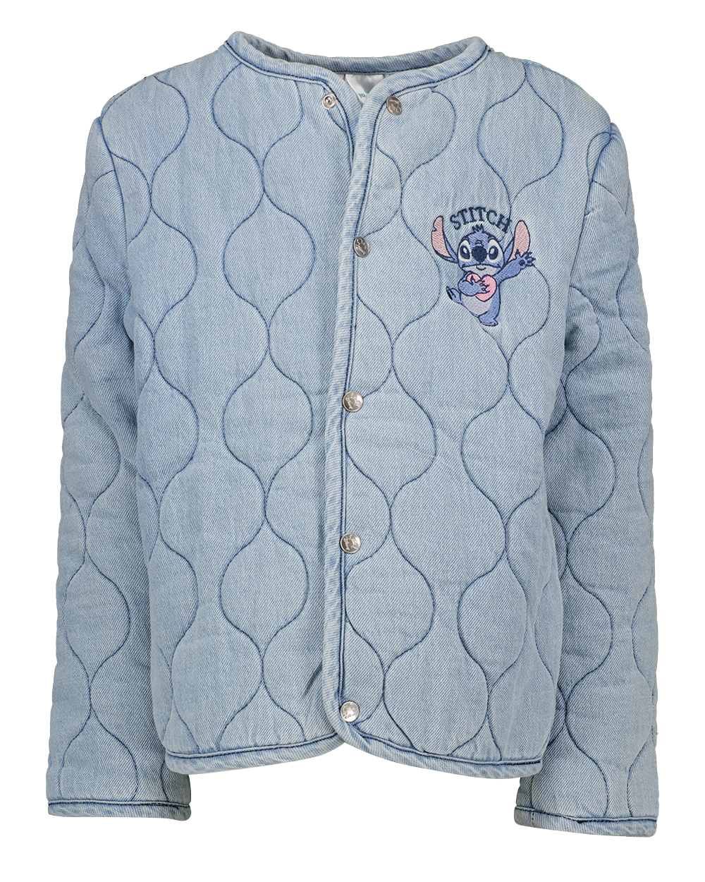 Deze blauwe meisjesjas is gemaakt van denim en heeft een doorgestikt patroon, waardoor hij stevig aanvoelt. De jas sluit met drukknopen aan de voorkant, zodat je hem eenvoudig open en dicht doet. Op de borst staat een afbeelding van Stitch, wat zorgt voor een speelse uitstraling. Dankzij het rechte model kun je deze jas makkelijk over een trui of shirt dragen.