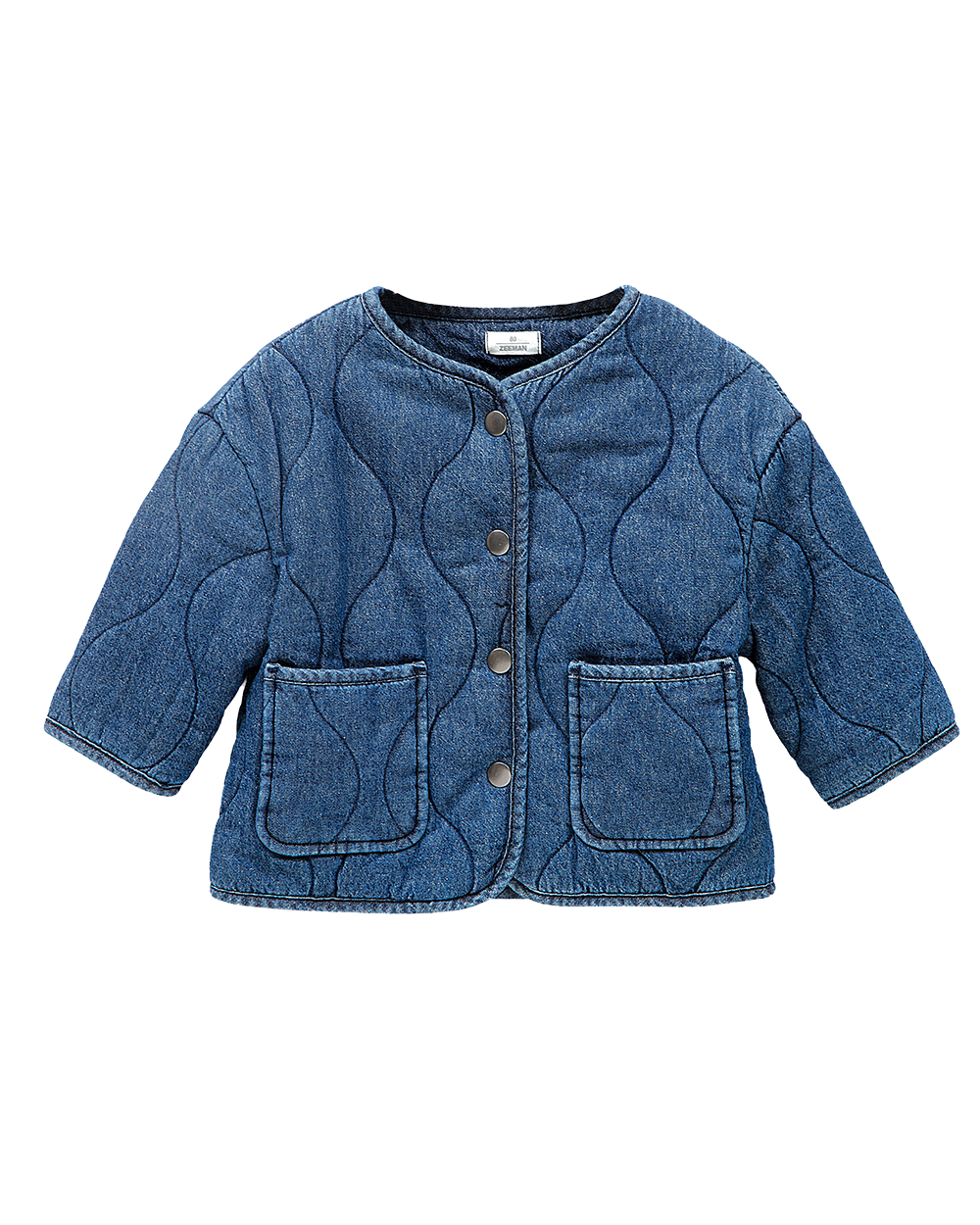 Deze blauwe denim jas voor baby's heeft een stevig doorgestikt patroon en sluit met knopen aan de voorkant. De jas is gemaakt van wat dikkere stof, zodat je baby warm blijft op frisse dagen. De jas heeft lange mouwen voor extra warmte.