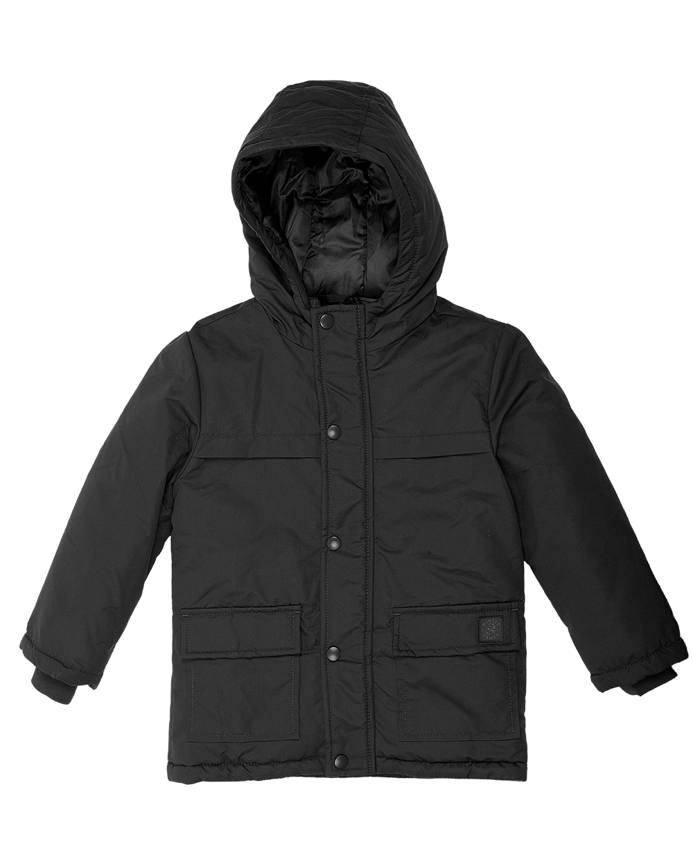 Deze zwarte jas voor meisjes is gemaakt van 100% polyester. De capuchon en lange mouwen beschermen goed tegen kou en wind. De jas sluit met drukknopen en heeft ruime zakken, handig om spullen mee te nemen of je handen warm te houden. De stevige stof zorgt ervoor dat de jas prettig zit en geschikt is voor dagelijks gebruik.