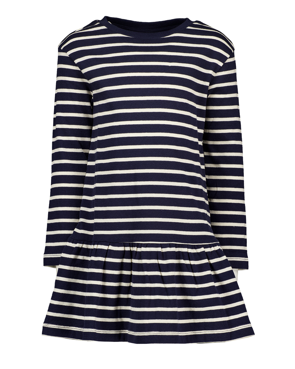 Deze blauwe jurk is gemaakt van 100% katoen en heeft een horizontaal streeppatroon in wit en donkerblauw. Het model heeft lange mouwen en een ronde hals. Onderaan de jurk zit een lichte rimpeling voor een speels effect. De katoenen stof zorgt voor een comfortabel gevoel. Een praktische keuze voor dagelijks gebruik dankzij het eenvoudige ontwerp en het zachte materiaal.