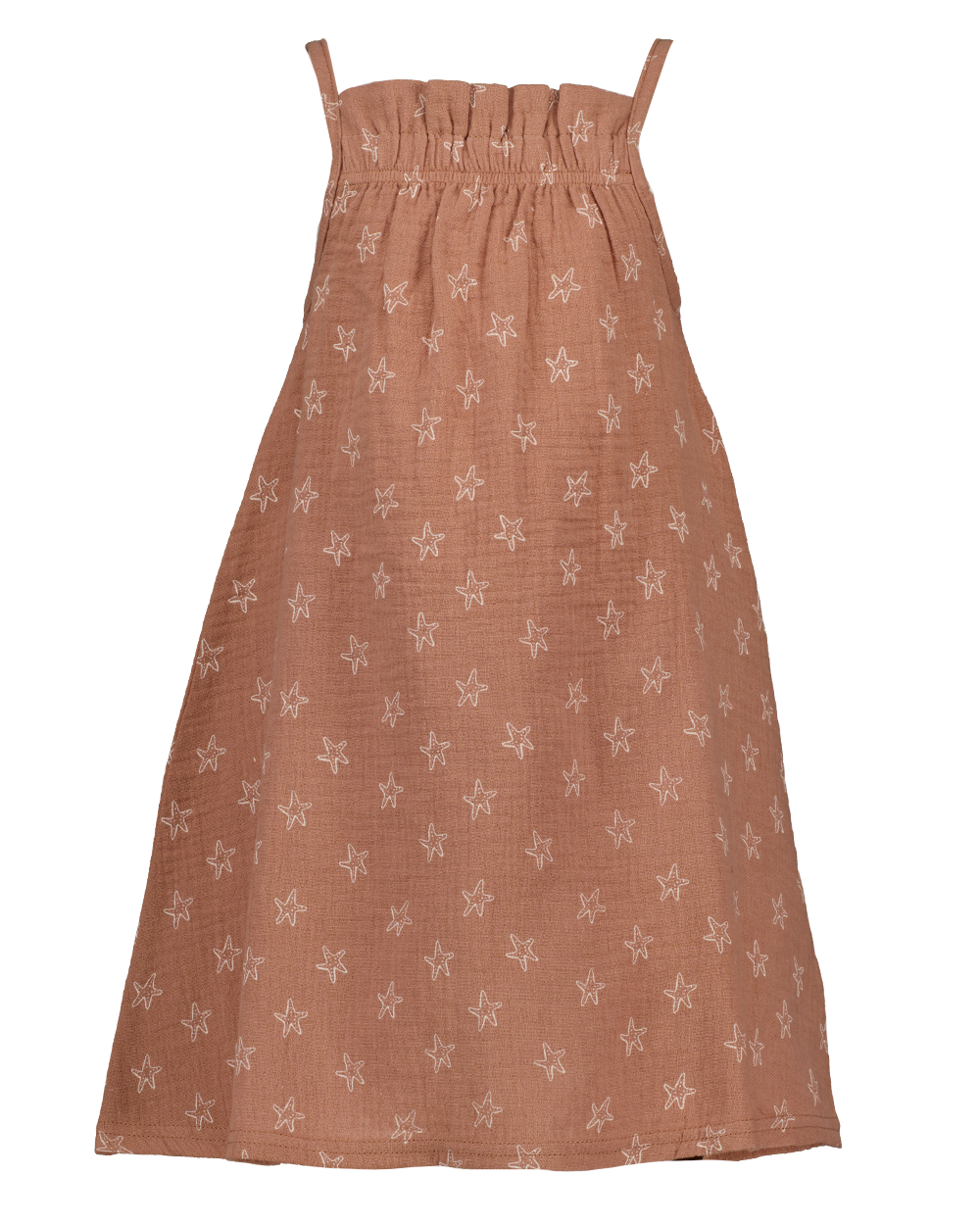 Deze bruine jurk is gemaakt van 100% katoen en heeft smalle schouderbandjes. De bovenkant is voorzien van een lichte rimpel voor een speels effect. De stof is bedrukt met een subtiel bloemenpatroon in een lichtere kleur. Door de rechte pasvorm en het luchtige materiaal is de jurk prettig te dragen tijdens warme dagen.