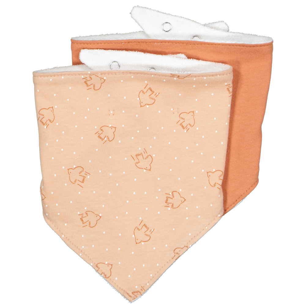 Deze slabbetjes zijn gemaakt van 100% katoen, wat zorgt voor een fijne, zachte touch. De set bevat twee slabbetjes in een frisse oranje kleur met een schattig patroon. Ze zijn met drukknopen te sluiten, wat gemakkelijk is voor jou en comfortabel voor je kindje. Ideaal om kleding schoon te houden tijdens het eten.