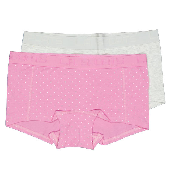 Deze set van 2 Lara boxers voor dames biedt comfort voor elke dag. Eén boxer is roze met witte stippen, de andere lichtgrijs. Ze zijn gemaakt van een zachte mix van katoen, polyester en elastaan. Door de elastische tailleband blijven ze goed zitten. De stof rekt licht mee, zodat je de hele dag prettig en vrij kunt bewegen.