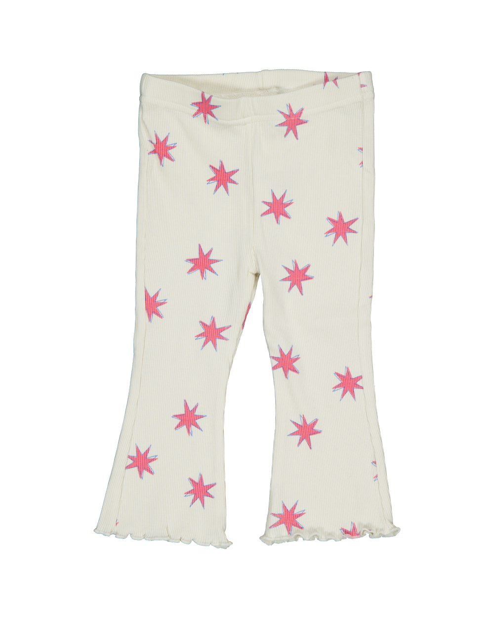 Deze beige legging voor baby's heeft een patroon met roze sterren. De stof is gemaakt van katoen met een beetje elastaan. Dit zorgt ervoor dat de legging zacht aanvoelt en licht mee rekt. De uitlopende pijpen geven extra bewegingsvrijheid. Door het vrolijke dessin is de legging prettig om te dragen tijdens het spelen.