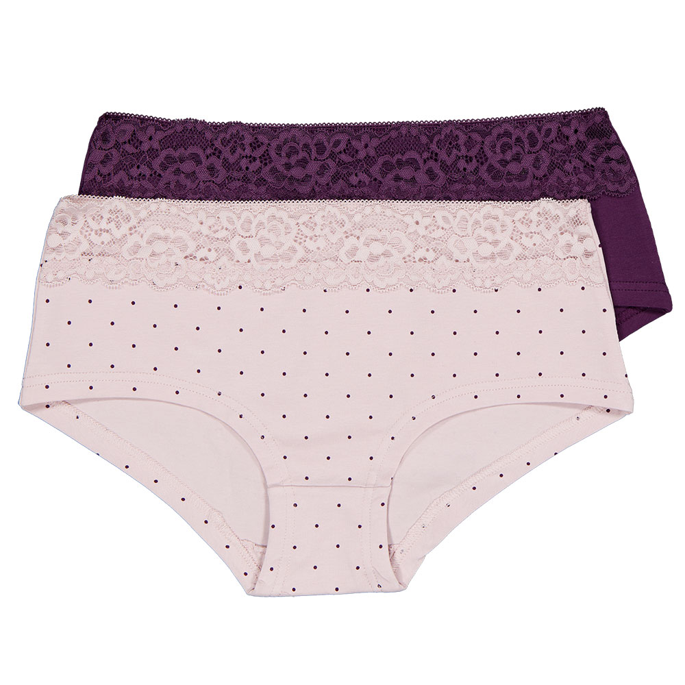 Deze set hipster onderbroeken voor vrouwen bevat twee comfortabele stukken in paarse en lichtgekleurde varianten met stippen. De zachte stof zorgt voor een fijne pasvorm, terwijl de kant aan de bovenrand een fraaie uitstraling biedt. Ideaal voor elke gelegenheid waarbij je comfort wilt combineren met een leuke stijl.