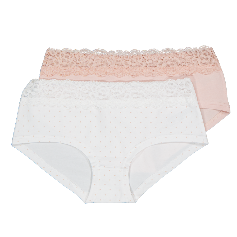 Deze set Linda hipsters voor dames bevat een witte variant met een subtiel stippenpatroon en een lichtroze uitvoering. Beide hipsters zijn afgewerkt met een brede kanten band aan de bovenkant. Dankzij het zachte katoen met elastaan voelt de stof comfortabel aan en sluit deze goed aan onder je kleding.
