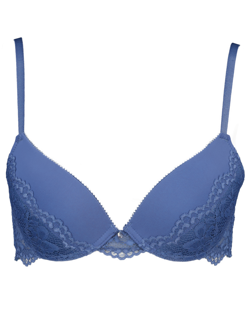 Deze blauwe bh heeft een lichte vulling en is gemaakt van kant. De samenstelling bestaat uit polyamide en elastaan, wat zorgt voor een zachte en flexibele stof. De bh bevat een zwevende beugel, die extra steun biedt zonder strak te voelen.