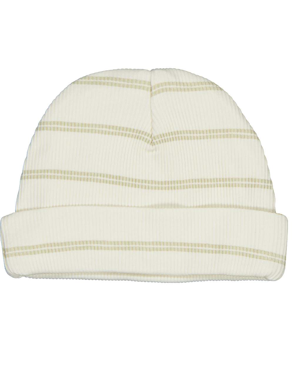Deze beige unisex baby hoed is gemaakt van een zachte stof met een samenstelling van 48% katoen, 48% viscose en 4% elastaan. De hoed heeft een fijn ribpatroon met subtiele horizontale streepjes in een lichtere tint. De omgeslagen rand zorgt voor een comfortabele pasvorm. Ideaal om het hoofdje van je baby warm te houden tijdens koelere dagen.