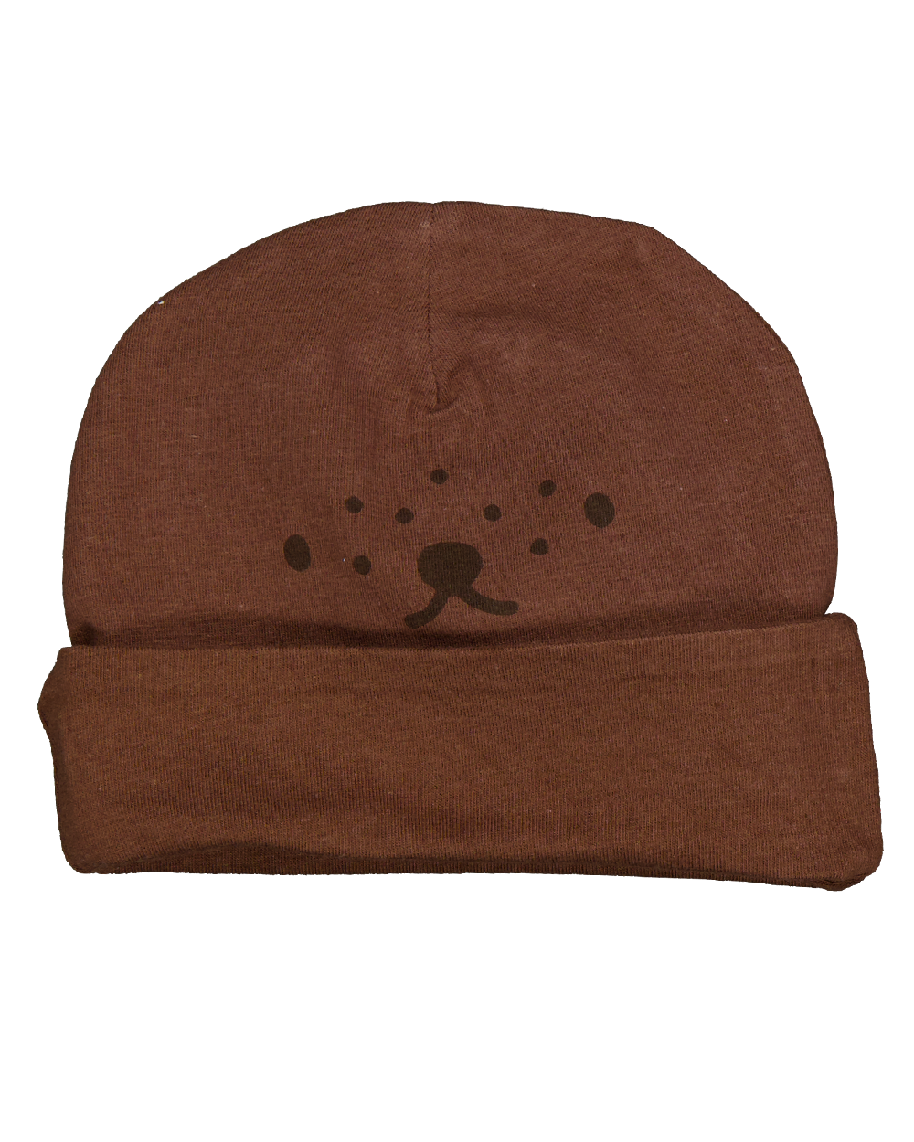 Deze bruine hoed is geschikt voor baby's en heeft een opgerolde rand. De hoed is uniseks en voelt zacht aan, waardoor hij fijn zit. Met de eenvoudige vorm blijft de hoed goed zitten en beschermt hij het hoofdje licht tegen kou.