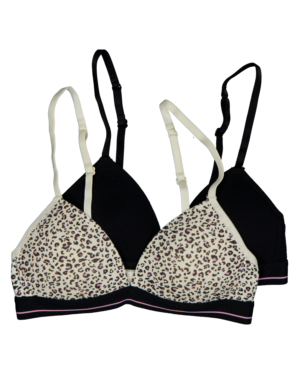 Set van twee meisjesbh's: één met panterprint en één effen. Beide bh's hebben verstelbare bandjes en een zachte, elastische band onderaan voor extra draagcomfort. Gemaakt van katoen, polyester en elastaan, waardoor ze zacht aanvoelen en prettig zitten. Geschikt voor meisjes die hun eerste bh zoeken met een fijne pasvorm en eenvoudige sluiting.