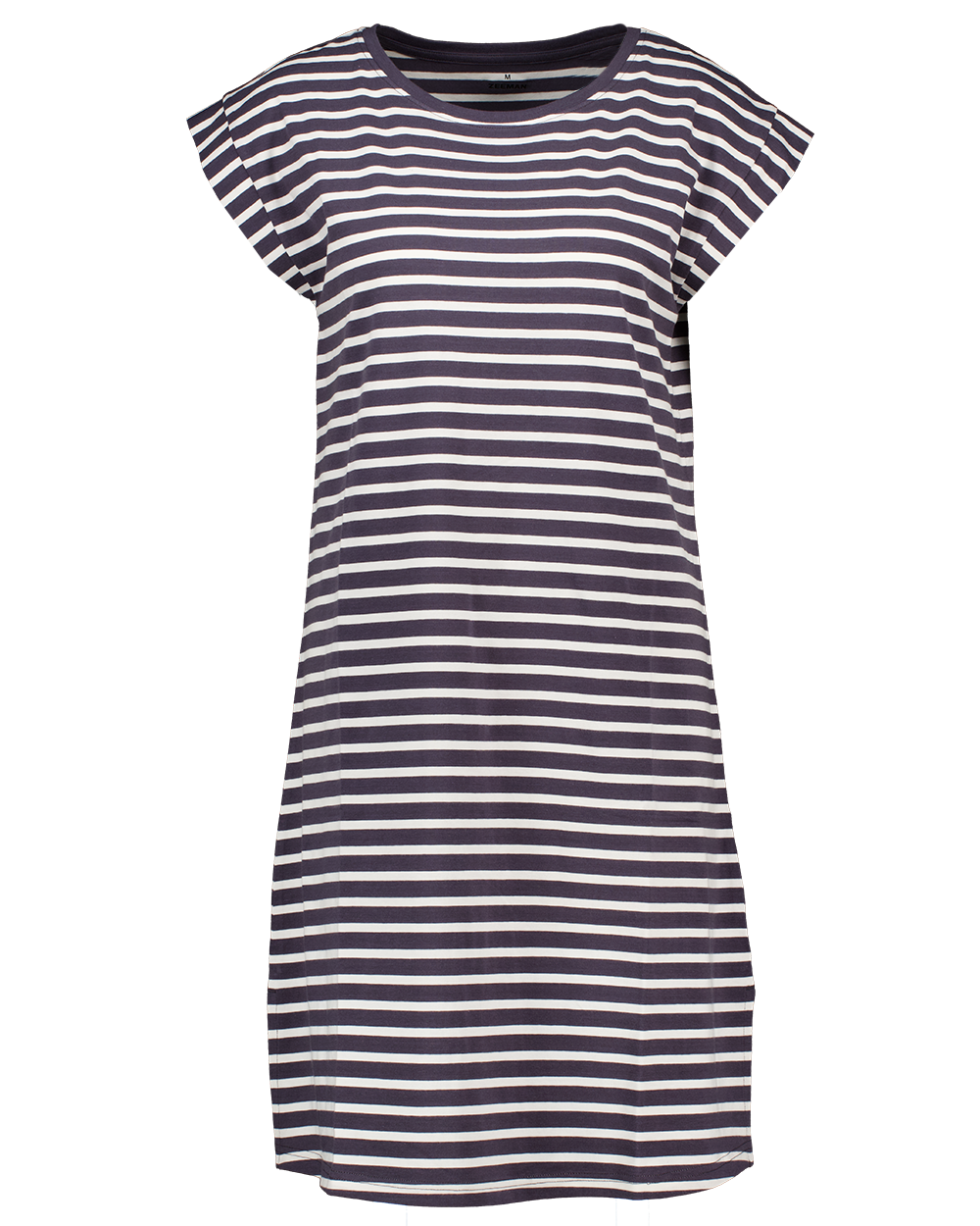 Dit damesnachthemd heeft een grijs-wit gestreept design en is gemaakt van 95% katoen en 5% elastaan. De stof is zacht en licht rekbaar, wat zorgt voor extra draagcomfort. Door de korte mouwen en ronde hals kun je je gemakkelijk bewegen in je slaap. De single jersey stof voelt soepel en luchtig aan, prettig voor een ontspannen nachtrust.