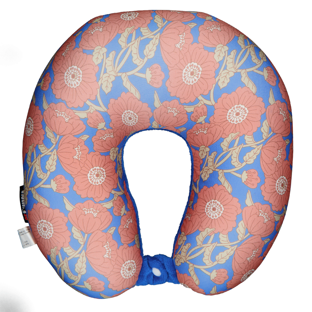 Dit nekkussen heeft een vrolijk patroon met grote rode bloemen en groene bladeren op een blauwe achtergrond. De zachte, ronde vorm biedt goede ondersteuning voor je nek. Handig tijdens het reizen of wanneer je thuis wilt ontspannen. Dankzij de drukknoop aan de onderkant blijft het kussen stevig zitten als je het om je nek draagt.