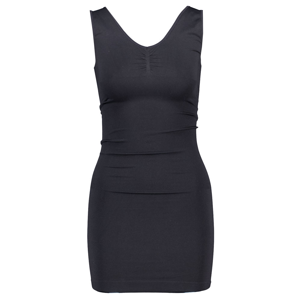 Deze zwarte shaping jurk voor dames is een praktisch kledingstuk. Shapewear is ondergoed dat je buik, heupen of benen wat gladder maakt en dus een vormend effect heeft. Deze mouwloze jurk is ideaal om onder een jurk of rok te dragen, zodat je kleding nog mooier valt. Door de extra smalle naden heb je geen last van irritatie en is deze jurk onzichtbaar onder strakkere bovenkleding. De schouderbanden zijn breed. waardoor ze goed op hun plek blijven zitten en je BH bandjes goed verborgen houden.