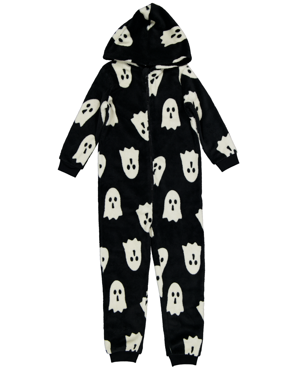 Deze onesie in het zwart heeft een patroon van witte spoken. De onesie is gemaakt van zachte coral fleece en heeft een capuchon voor extra warmte. De rits loopt van boven naar beneden, zodat je de onesie makkelijk aan- en uittrekt. Elastische boorden zorgen voor een goede pasvorm.