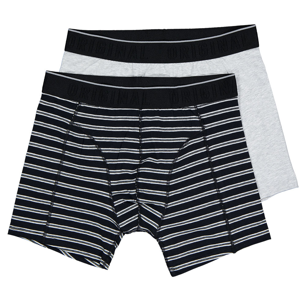 Deze set van 2 boxers voor heren bestaat uit een extra lang model. Eén boxer heeft een zwart-wit streepje, de andere is lichtgrijs met een zwarte tailleband. De brede, elastische tailleband zorgt ervoor dat de boxers goed blijven zitten. Dankzij katoen met elastaan sluiten ze prettig aan, waardoor je de hele dag comfortabel kunt bewegen.