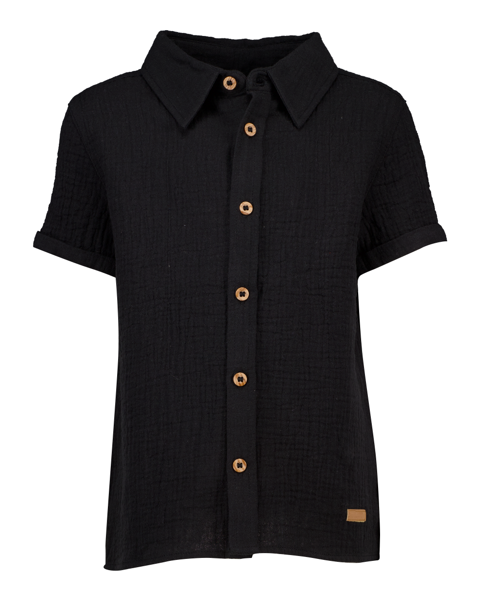 Deze zwarte overhemd is gemaakt van 100% katoen en heeft een klassieke kraag. De korte mouwen en de structuur van de stof zorgen voor een luchtig draagcomfort. De sluiting aan de voorkant bestaat uit knopen met een opvallende lichte rand. Op de onderzijde zit een subtiel label bevestigd. Geschikt om netjes te dragen of juist casual te combineren.
